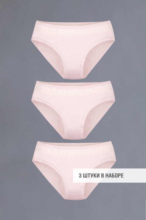 Комплект трусиков для девочки. В наборе 3 штуки. Изделия выполнены из хлопка с добавлением эластана. Кружево с узором по краю. Удобная эластичная резинка. Средняя посадка. Однотонный цвет, без рисунка и надписей. Базовая модель. Трусики отлично подойдут для повседневной носки. Нижнее белье не подлежит возврату или обмену на аналогичные модели других размеров или фасонов.