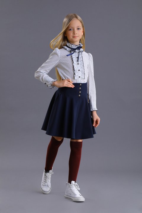 Стильная школьная блузка для девочки. Модель выполнена из мягкого приятного на ощупь трикотажа и нежного кружева. Приталенный силуэт и ажурные рукава-фонарики придают образу легкости. Блузка застегивается спереди на фирменные пуговицы с нотами.