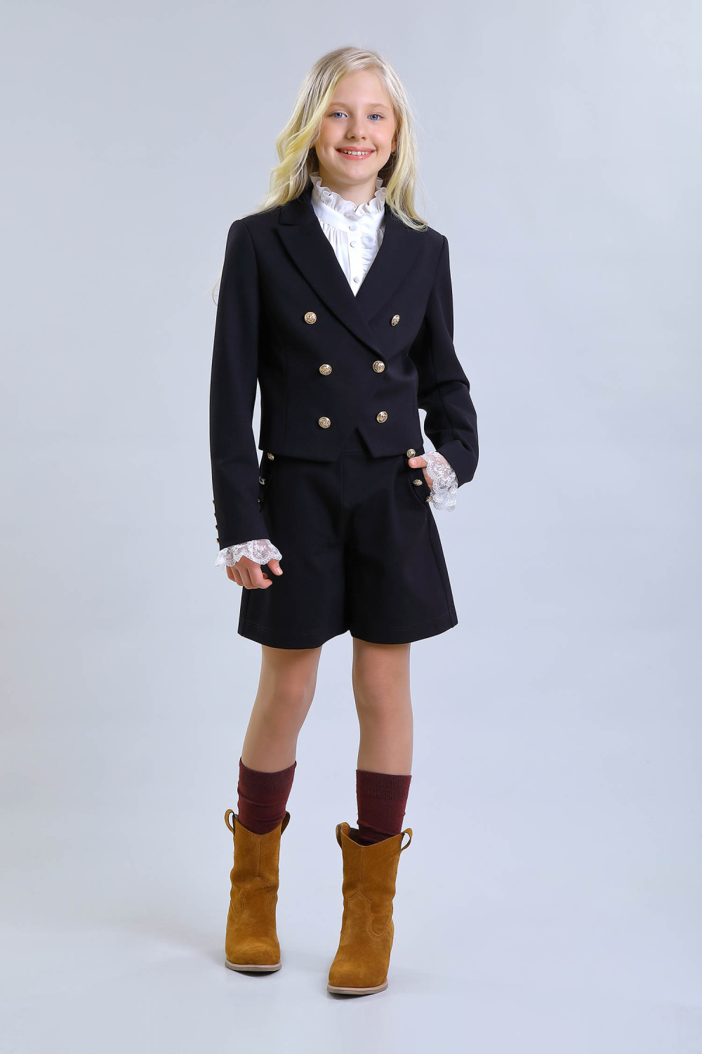 Укороченный жакет из костюмного трикотажа. Отложной воротник двубортный воротник. Приталенная модель. Застежка осуществляется на пуговицы.