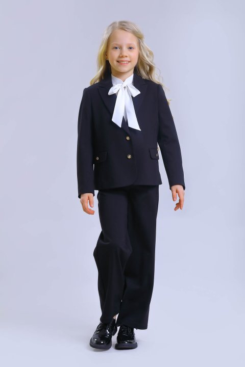 Нарядная блузка из искусственного шелка. Круглый отложной воротник. Горловина украшена бантами. Вдоль планки воланы-кокилье. Застежка на потайные пуговицы.