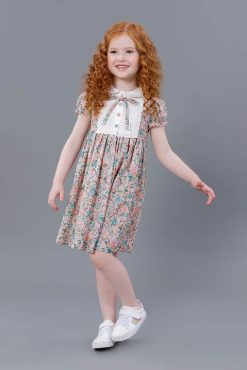 Нарядное платье из мягкой сетки, декорированой вышивкой, мини-помпонами и объемными цветами из ткани. Горловина оформлена объемными цветами из ткани. Рукава-фрнарики. Трикотажная подкладка (хлопок). Модель без застежек.