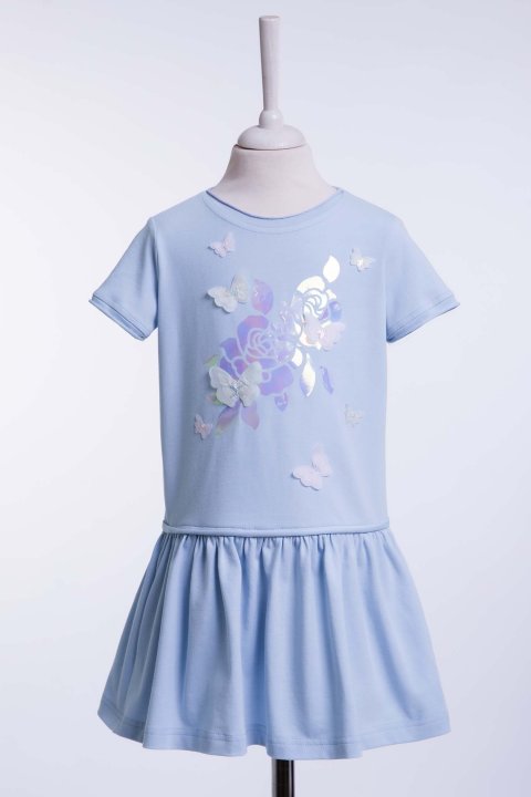 Платье для девочки с декоративным принтом и бабочками. Лаконичный верх с короткими рукавами украшен эффектным принтом с цветочным мотивом и объёмными декоративными бабочками. Платье имеет удобный прямой крой по верху и мягко присборенную юбку, обеспечивающую свободу движений и комфорт в течение всего дня. Модель выполнена из приятного на ощупь материала, идеально подходящего для тёплого сезона.