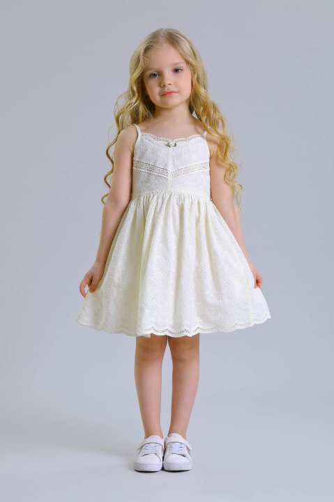 Атласное нарядное платье для девочки. Удобная модель для малышей, пышная юбка скрывает животик. Ажурный воротничок украшен бантом из атласной ленты. Короткие рукава-фонарики сверху покрыты сеткой, низ на резинке. На лифе отделка кружевом и тесьмой. По бокам подвязки, которые можно завязать на спинке в красивый бант.