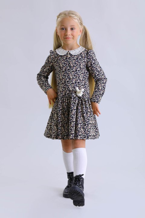 Повседневное платье для девочки. Модель выполнена мягкого хлопка. Платье с короткими рукавами-фонариками, низ рукавов на резинке. Горловина украшена вязаным ажурным воротником и бантом с атласной розой. В комплекте идёт резинка-мишка. Изделие застегивается сзади на пуговицы. Линия талии имеет длинные завязки, которые можно завязать на спинке в красивый бант.