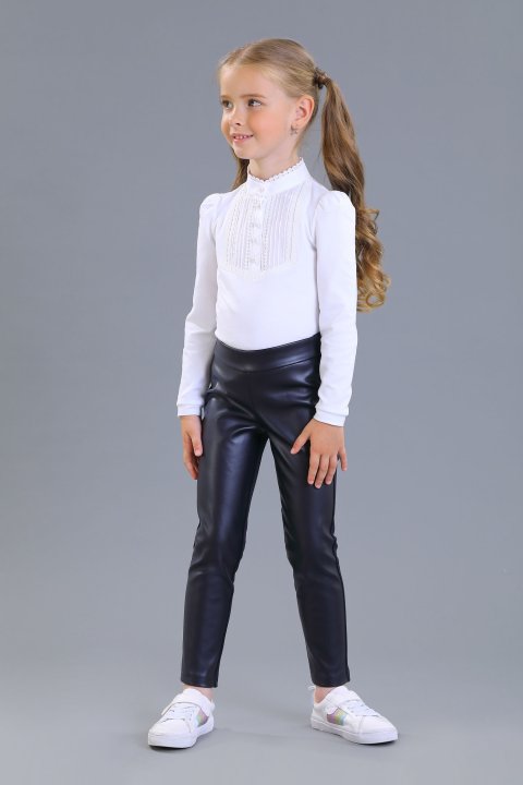 Повседневный лонгслив для девочки. Модель выполнена из хлопковой кулирной глади - мягкой на ощупь ткани. Блузка с длинными рукавами. Горловина декорирована оборкой из эластичного кружева. Имитация застежки украшена кружевом, оборкой, пуговицами с эмалью и стразами. По центру атласный бантик. Изделие без застежек, легко снимается и надевается через голову.