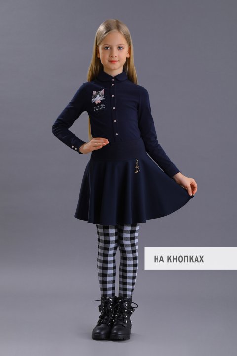Блузка для девочки. Модель выполнена из мягкого хлопка. Блузка с классическим отложным воротником. Рукав оформлен втачным воланом кокилье. Спереди есть накладной карман с шевроном и шильдиком ML со стразами. Модель с удлиненной спинкой. Изделие застегивается спереди на кнопки.