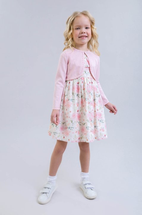 Вязаный кардиган для девочки. Модель выполнена из пряжи с содержанием шерсти и мохера. Полочки и спинка из ажурного полотна. Застежка на пуговицы с жемчужным блеском. Горловина, планка, манжеты и низ изделия отделаны резинкой. Манжеты и низ изделия с фестонным краем украшены стразами-полусферами.