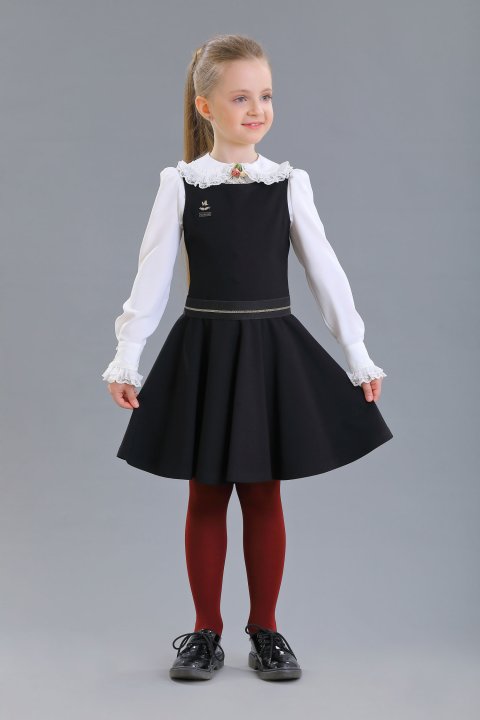 Нарядная школьная блузка для девочки. Модель выполнена из красивой узорной ткани. Прозрачная сетка-мушка на рукавах дополнена изысканными вставками из кружева. Модель украшена очаровательными бантиками из атласа, ажурной тесьмой и жемчужными бусинами. Изделие застегивается на спинке на красивую молнию. Блузка смотрится очень нарядно и отлично подходит для торжественных школьных мероприятий.