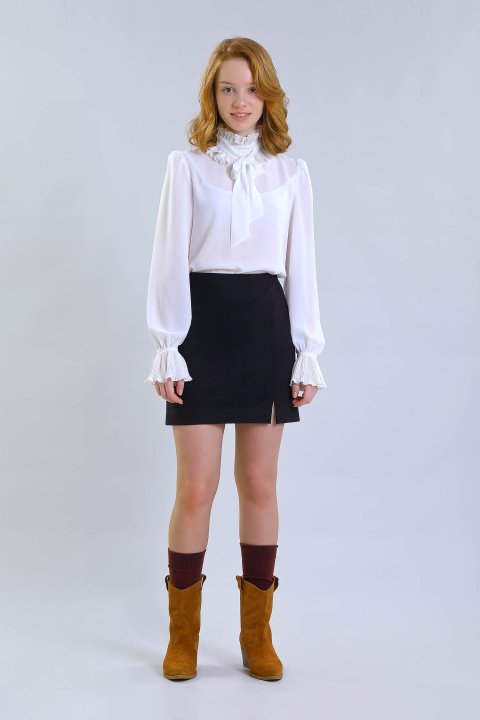 Нарядная школьная блузка для девочки. Модель выполнена из синтетической блузочной ткани, визуально текстура поверхности напоминает натуральный шелк. Изделие комфортно в носке, гипоаллергенно и долго сохраняет форму благодаря качественным волокнам в составе. Роскошный бант на шее добавляет блузке романтичности и изящества. Украшение снимается, бархатная лента регулируется по размеру. Очаровательные воланы по бокам планки дополнены контрастным кантом глубокого темно-синего цвета. Удобные манжеты на широкой резинке украшены изысканными бантиками из атласа. Изделие застегивается спереди на оригинальные пуговицы с бабочками.