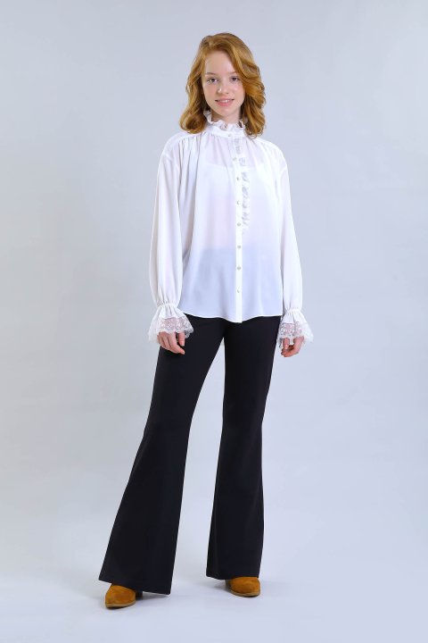 Школьные брюки с завышенной талией для девочки. Модель выполнена из костюмного трикотажа. Износостойкая плотная ткань отлично держит форму. Брюки заужены к низу. С внутренней стороны на поясе есть регулировка обхвата по талии. По бокам имеются трикотажные вставки. Изделие застегивается на классическую молнию и фирменные гербовые пуговицы.