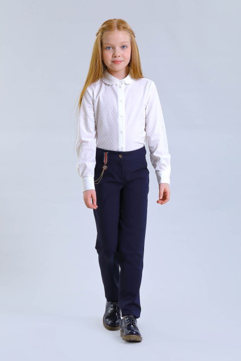 Нарядная школьная блузка из синтетического шелка. Блузка с высокой горловиной украшена пышными рюшами. В центре белоснежные розочки из узких атласных лент. Воздушные рукава выполнены из гофрированной ткани, по низу собраны на резинку. Изделие застегивается на спинке на молнию с красивым пуллером.