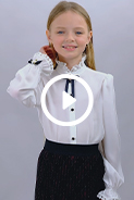 Школьная блузка с воротником-стойкой. Стойка декорирована кружевом. По центру кремовые розочки, которые крепятся на булавку. Рукава по низу оформлены манжетами на сборке. Модель застегивается спереди на пуговицы контрастного цвета.
