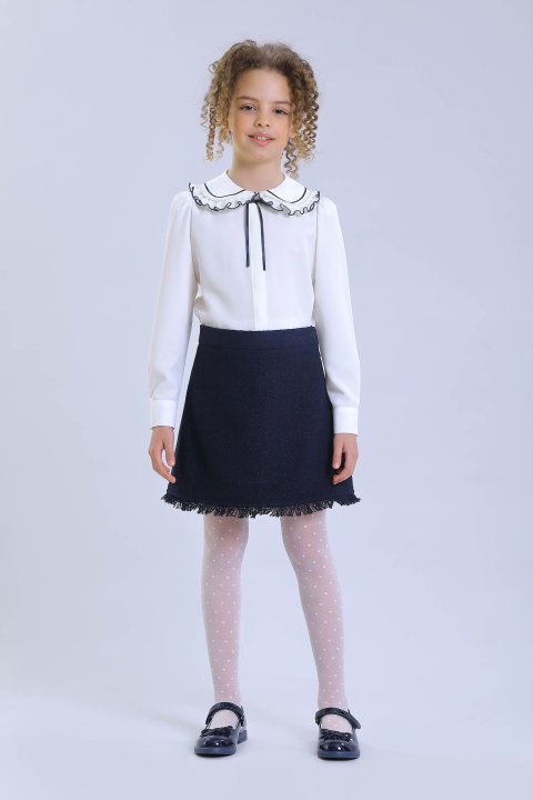 Школьный сарафан из букле. Модель А-силуэта с V-образным вырезом. Фальш-карманы по бокам с клапаном и фирменной пуговицей. Модель без застежек на поливискозной подкладке.