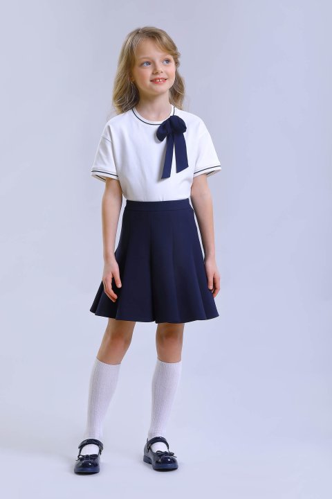 Школьное платье из бархата с длинными рукавами. Лиф на хлопчатобумажной трикотажной подкладке, юбка на поливискозной подкладке. На линии талии сбоку фирменный шильд. Застежка на молнию на спинке. В комплекте два разных съемных воротника из кружева и искусственного шелка. Один воротник с бантом, второй с брошью-камеей.