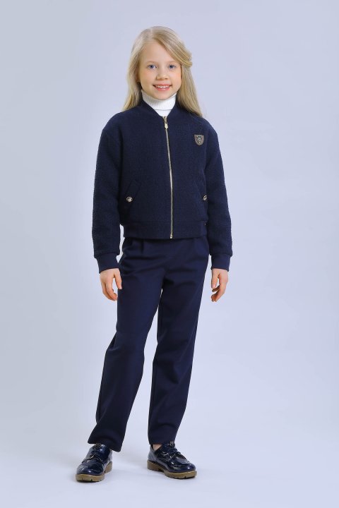 Школьный жакет из бархата, на поливискозной подкладке. Изделие с круглой горловиной, без воротника. Укороченная модель прямого силуэта. На полочке пришивной элемент буква 'М' со стразами. Застегивается на фирменные пуговицы с эмалью.