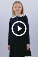 Школьное платье из костюмного трикотажа. Модель с длинными рукавами и юбкой солнце. Съемный воротник декорирован контрастной атласной лентой, тесьмой с бусинами и рюшем из ткани микро-гофре. Горловина украшена бантиком из тонкой атласной ленты. Застегивается спереди на фирменные пуговицы с буквой 'М'. Рукава по низу декорированы пуговицами. Изделие без подкладки.
