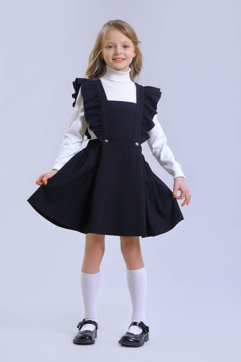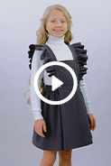 Школьный сарафан. По бокам лифа располагаются воланы на сборке. На полочке заложены горизонтальные защипы. Боковые участки пояса присборены эластичной тесьмой. Застегивается на фирменные пуговицы с эмалью. Изделие на поливискозной подкладке.