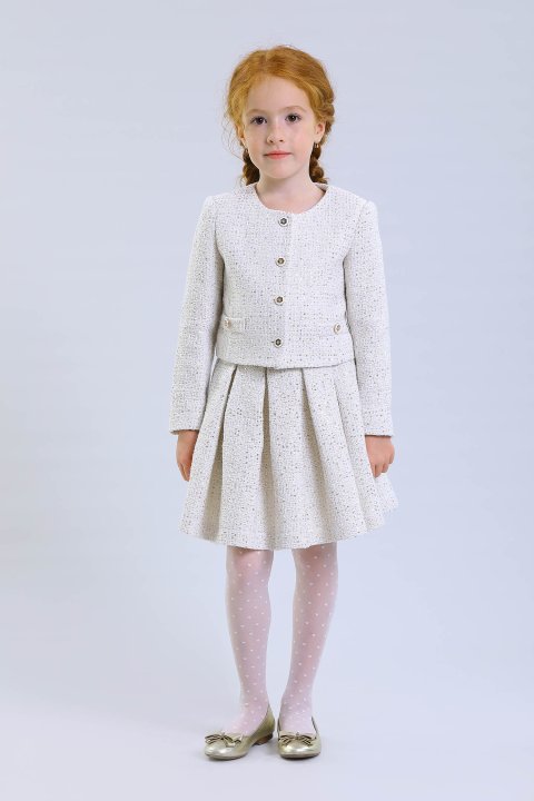 Нарядный жакет для девочки. Модель выполнена из букле с люрексом. Жакет на вискозной подкладке. Укороченный жакет с длинными рукавами. Изделие застегивается спереди на пуговицы. Отлично сочетается с юбкой 2815-126-ВПБ.